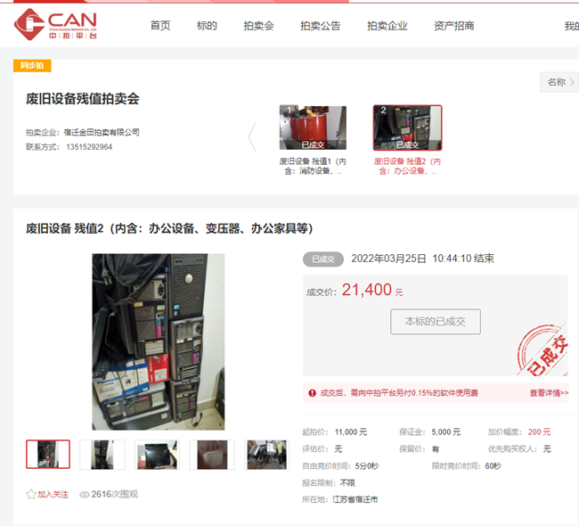 3月25日上午10時30分,開發(fā)公司一批廢舊辦公設(shè)備、辦公家具、變壓器等物資在中拍平臺公開拍賣,7家競買人,經(jīng)過14分10秒緊張激烈競價,最終以21400元成交。