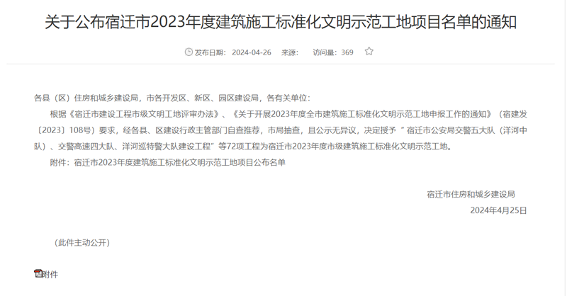 近日,宿遷市2023年度建筑施工標準化文明示范工地項目名單發(fā)布,蘇宿工業(yè)園區(qū)智慧信息產(chǎn)業(yè)園項目榮獲2023年度市級建筑施工標準化文明示范工地榮譽稱號。